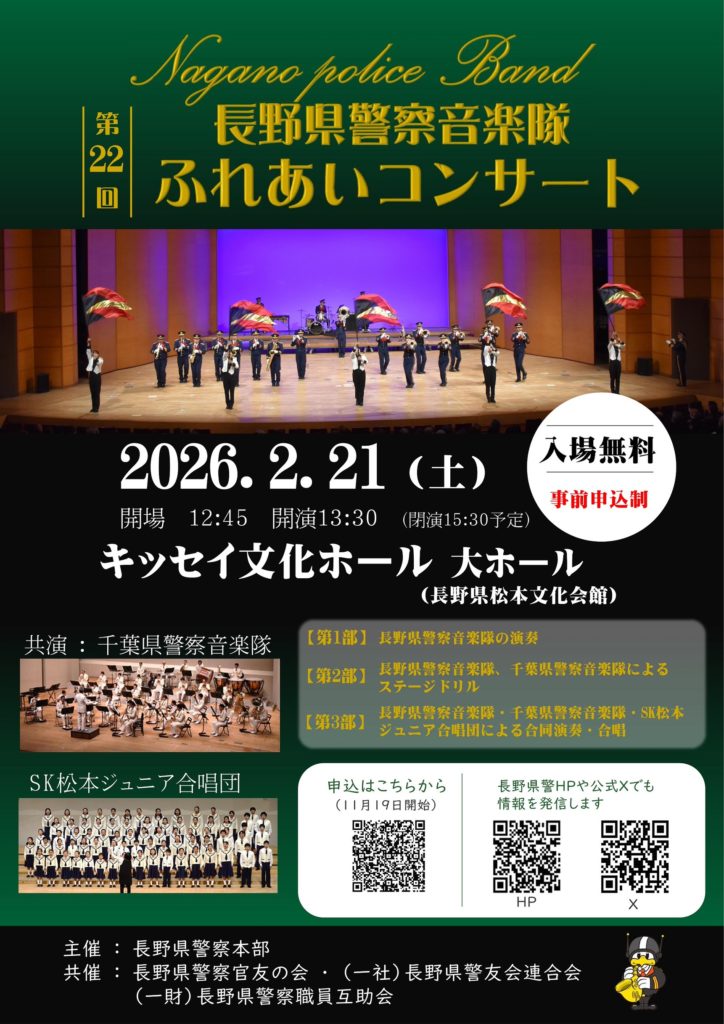 「第22回 長野県警察音楽隊 ふれあいコンサート」に出演いたします。